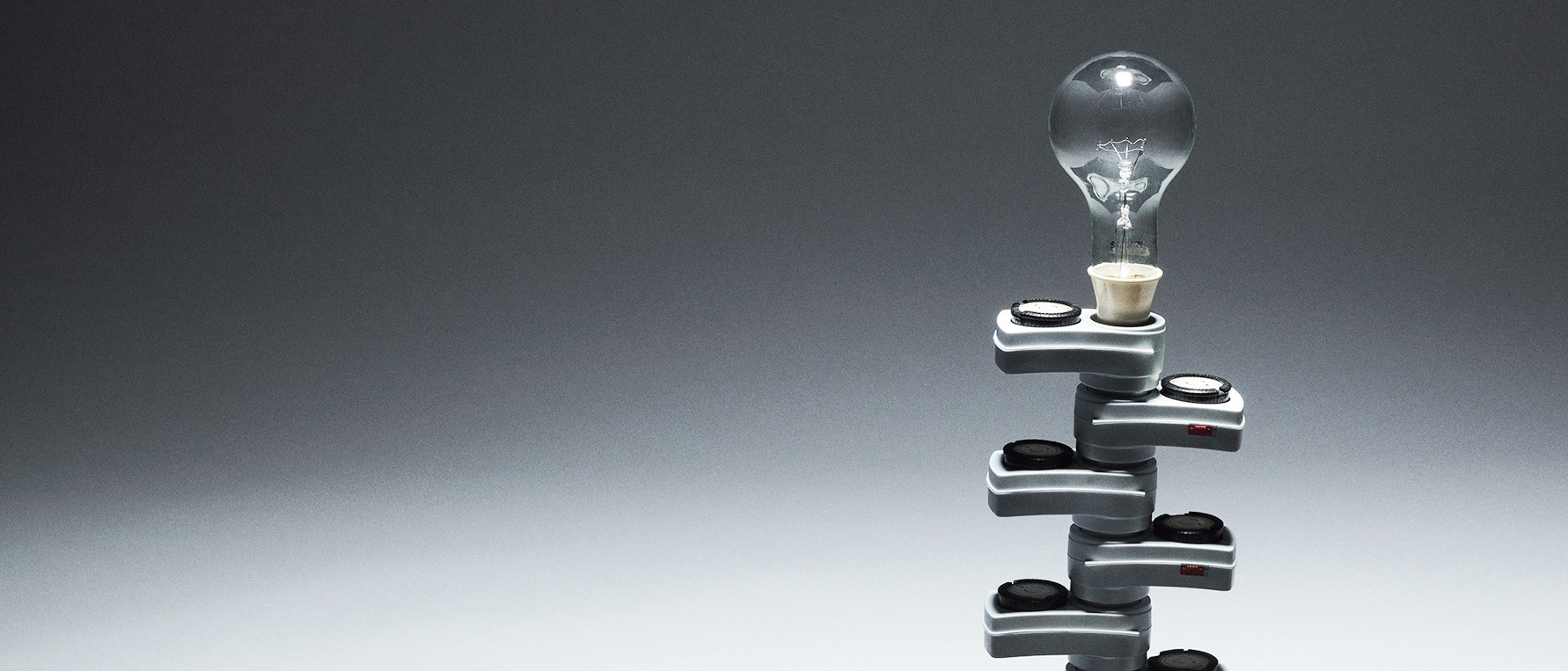 På gulvet ligger et blankpoleret sort kvadrat, hvor op af der rejser sig en mærkværdig, skulpturel form bestående af ti el-timere sat sammen i række og med en glødepære for enden.