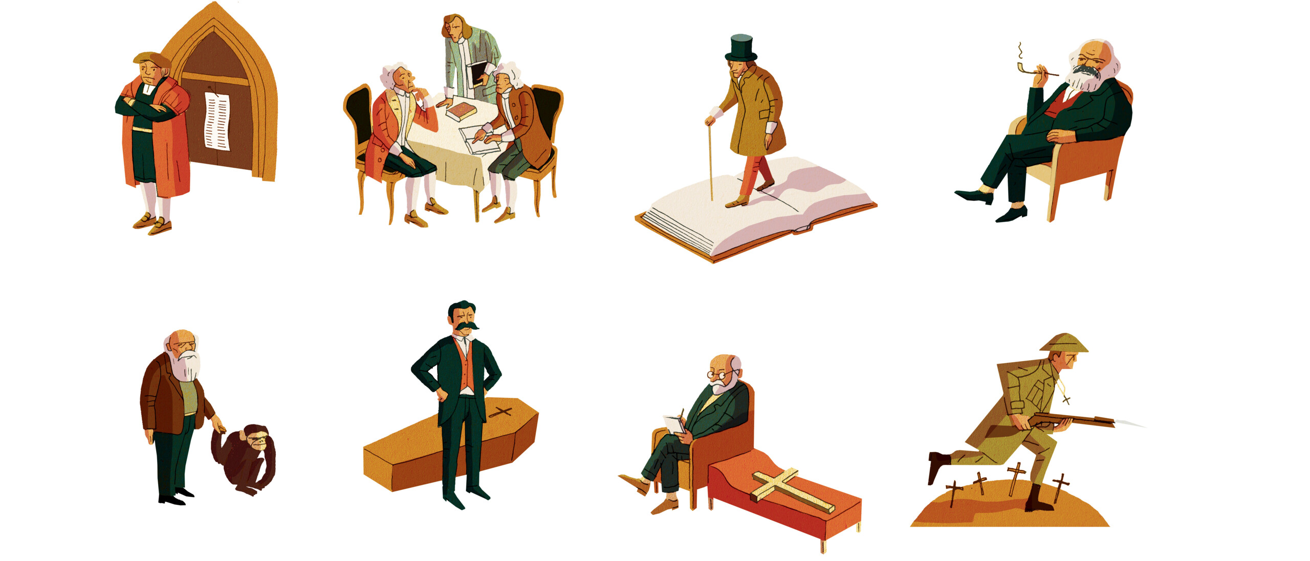 Tyske filosoffer som blandt andre Ludwig Feuerbach, Karl Marx og Friedrich Nietzsche angriber i en række skrifter kristendommen og hele det etablerede religiøse system.