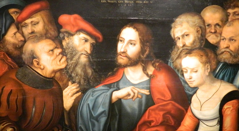 "Kristus og kvinden grebet i hor", Lucas Cranach d. Ældre, 1532 (udsnit). Maleriet henviser til Johs. 8.1-11, hvor Jesus siger: "Lad den, som er uden synd, kaste den første sten". At ingen er syndfrie er en vigtig luthersk pointe.
